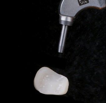 Figure 2. Sandblasting residual cement from a lithium disilicate onlay with 50-micron glass beads